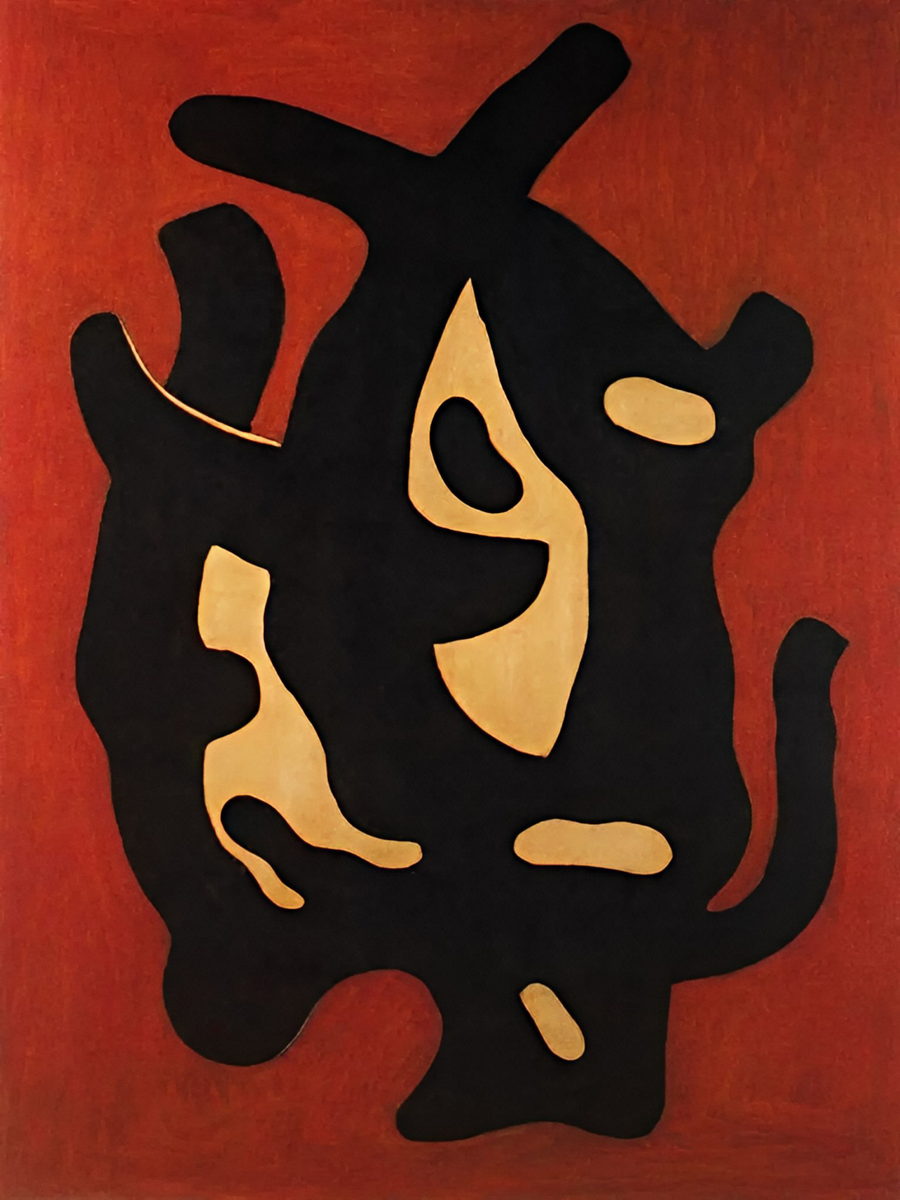 Reproduction of “Black Root” by Fernand Léger. An intense biomorphic abstract artwork with a dominant black shape on a red background.