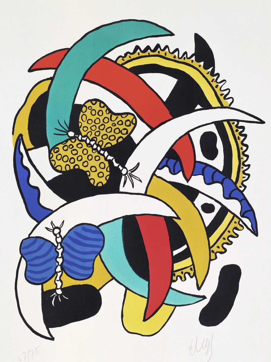 Reproduction of “Butterflies” by Fernand Léger. An abstract, graphic artwork blending butterflies and mechanical shapes on a white background.