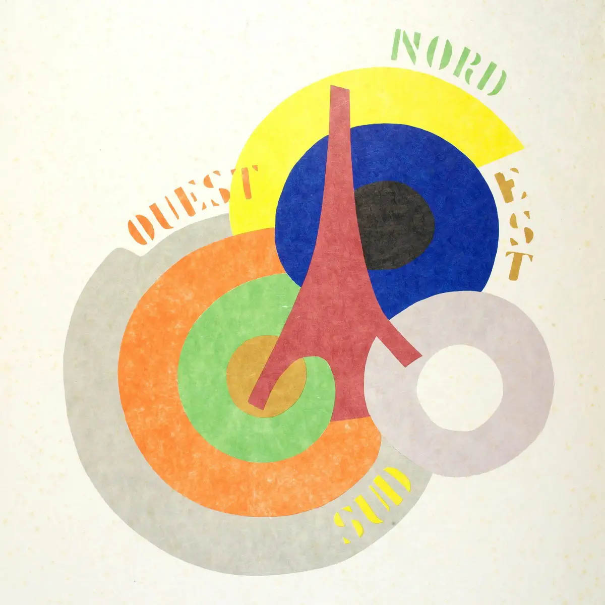 A graphic composition by Robert Delaunay. “North East South West” is an Orphic vision of Paris with the Eiffel Tower and pure colors.