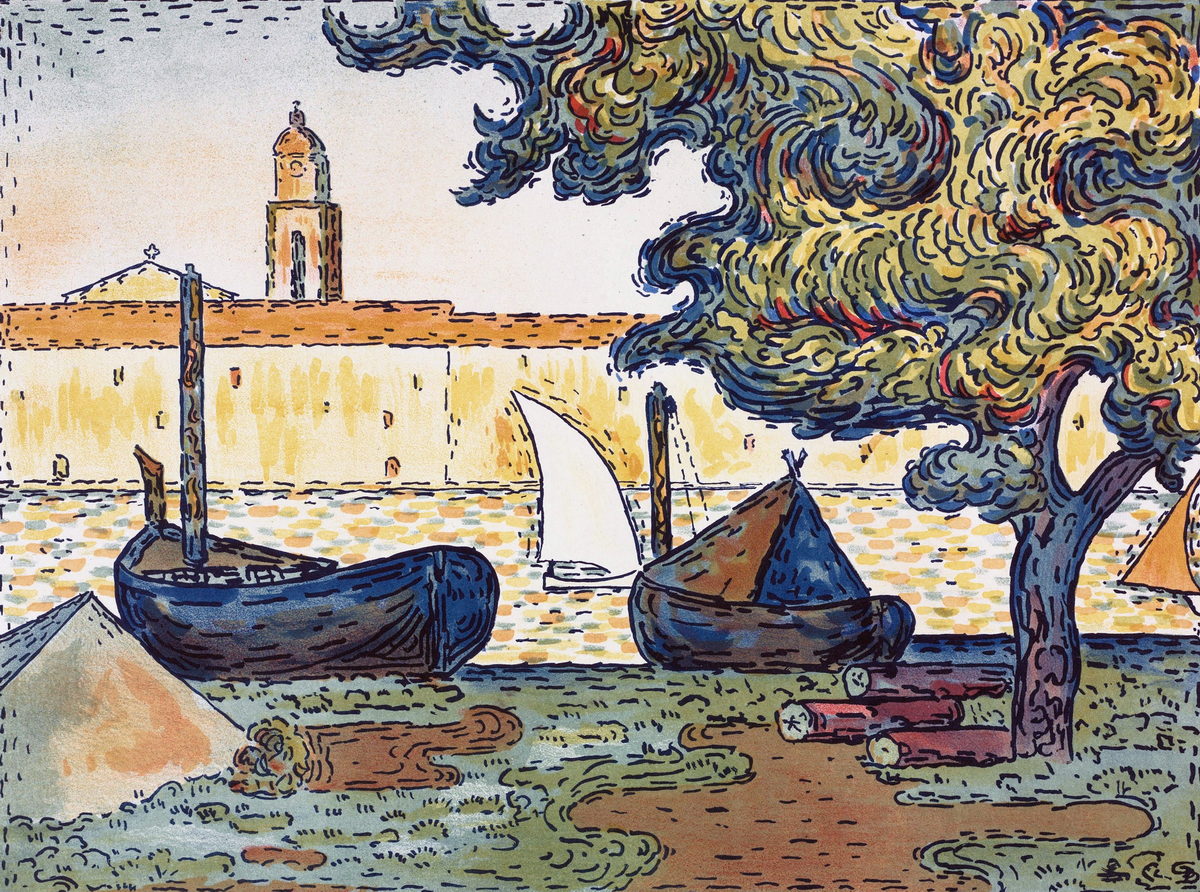 Reproduction of The Port of Saint-Tropez by Signac, a colorful view with a tree in the foreground.