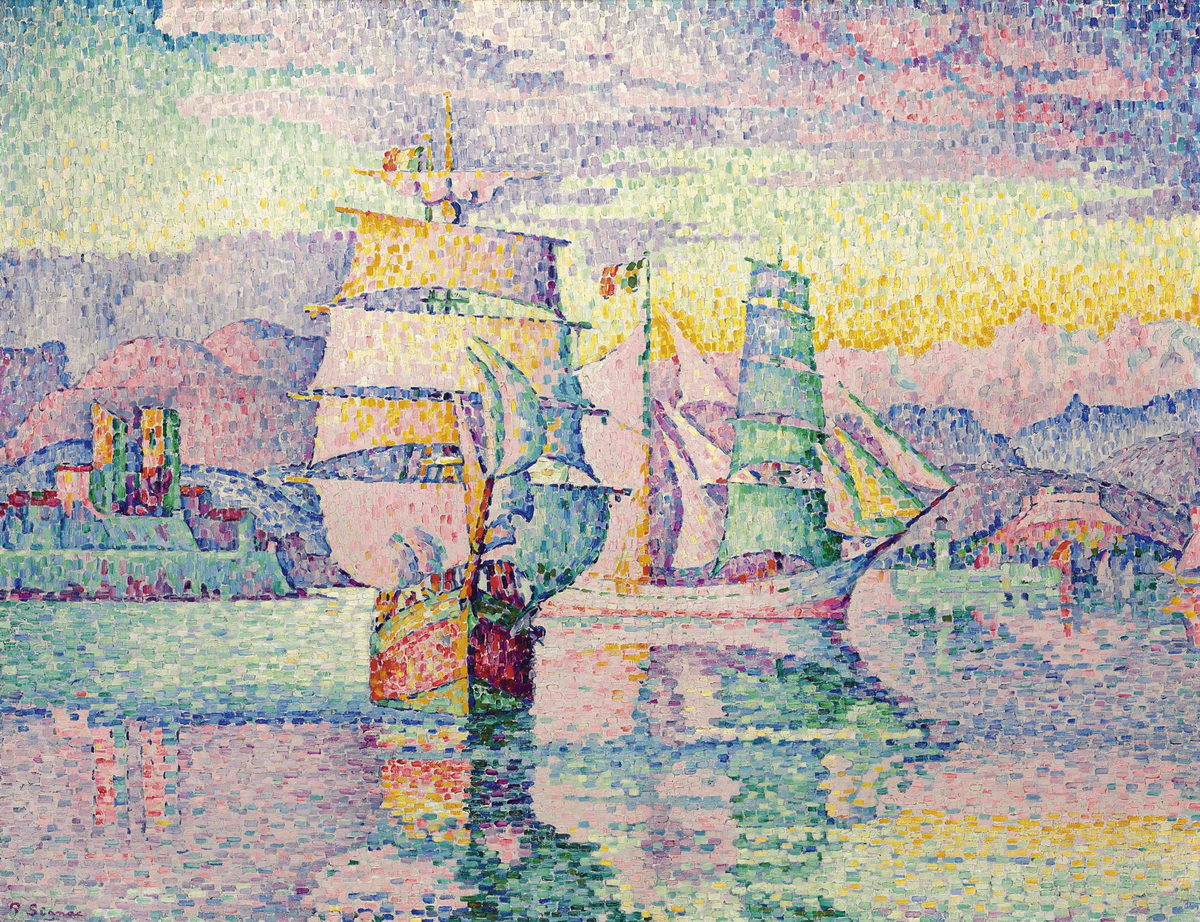 Reproduction of The Brig-Schooners in Antibes by Signac, a seascape with pastel tones.