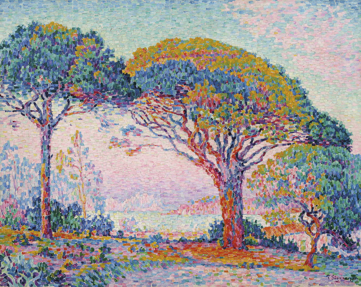 Colorful reproduction of umbrella pines in Saint-Tropez by Paul Signac.