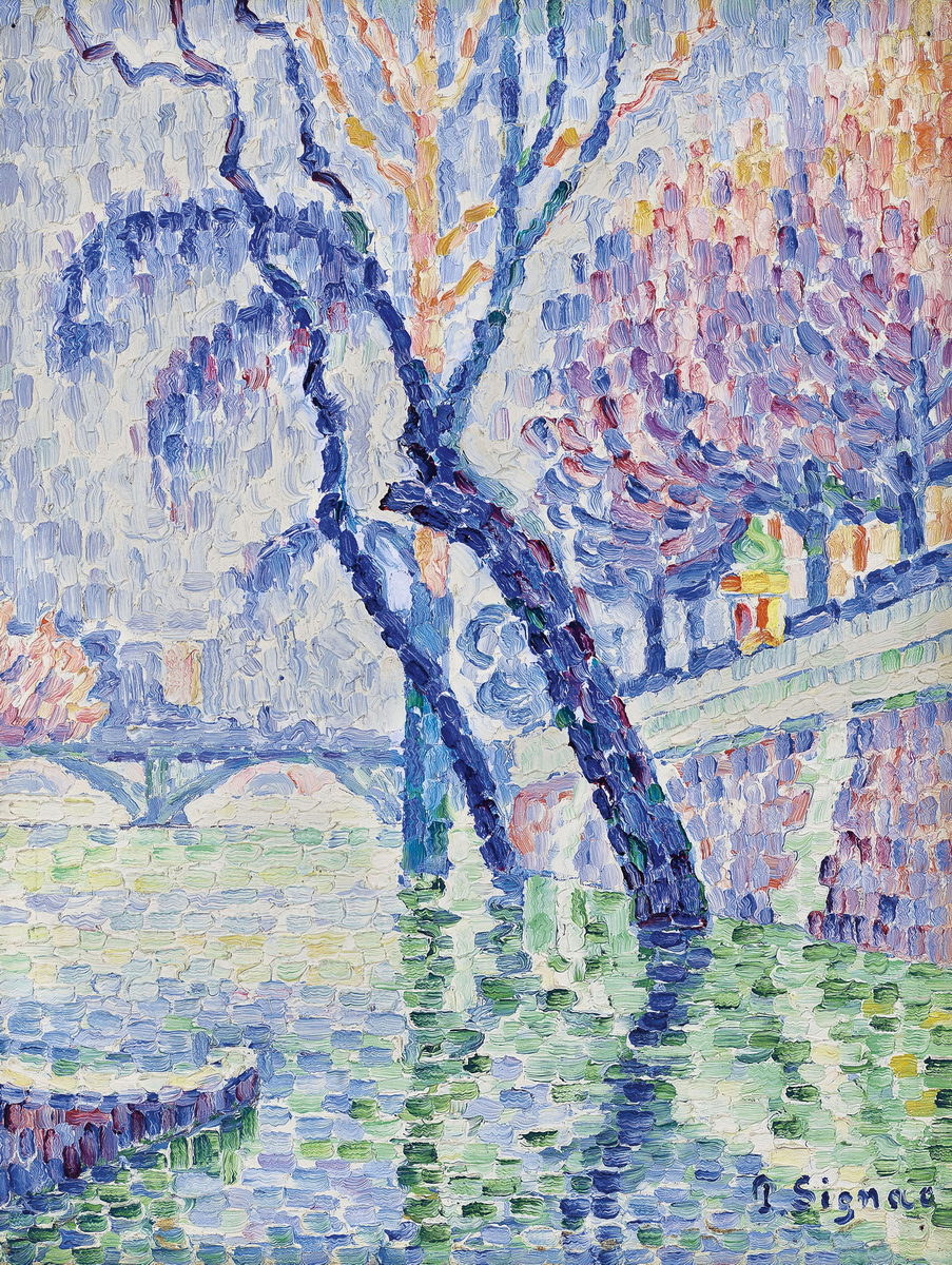 Reproduction of The Pont des Arts during a flood by Signac, an atmospheric view of Paris.