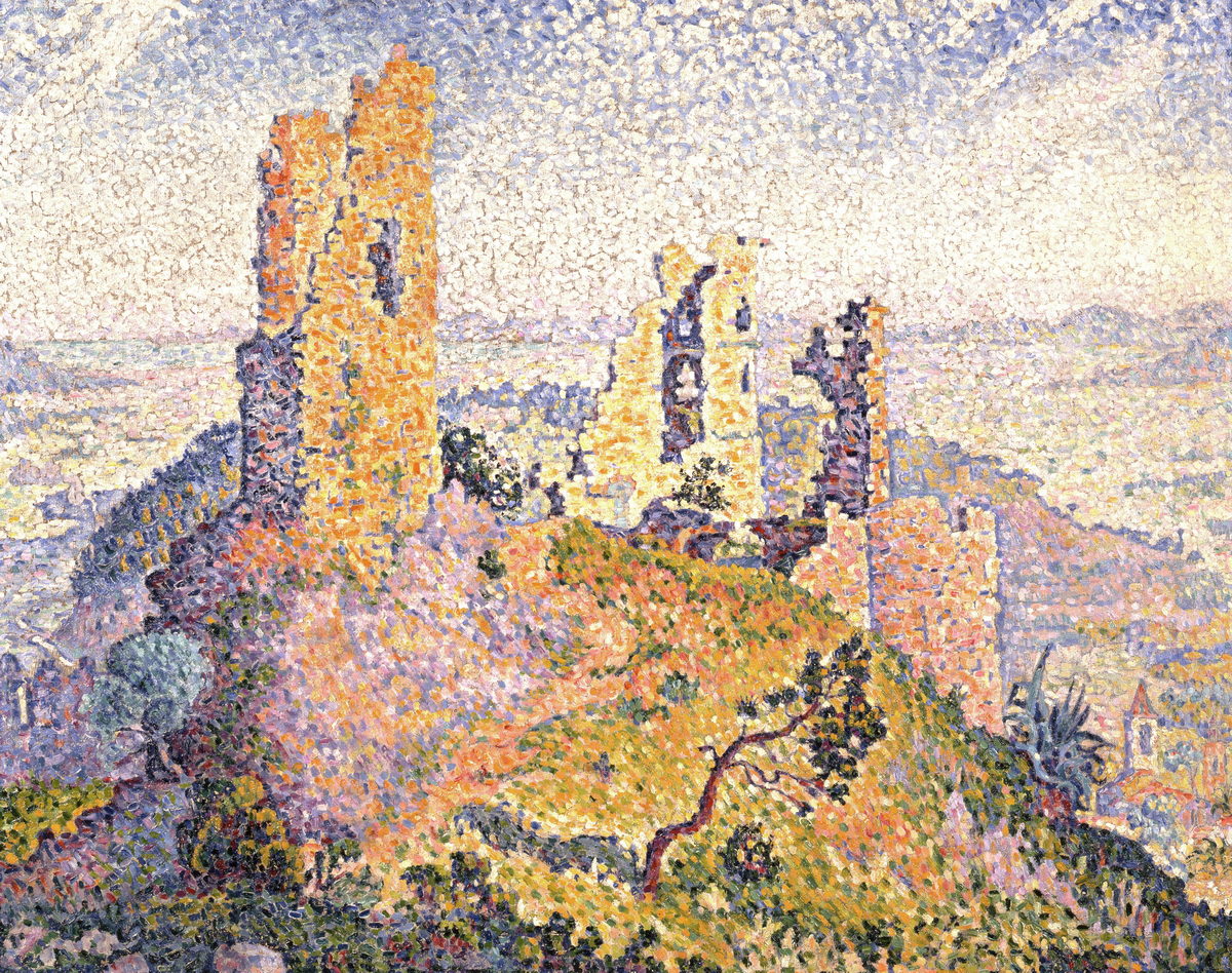 Reproduction of The Ruins at Grimaud by Signac, a sunny landscape of the Var hinterland.