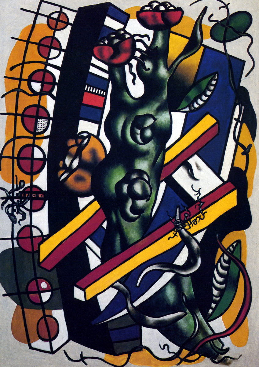 Reproduction of “The Tree in the Scale” (1943) by Fernand Léger. A biomorphic abstract painting with bright colors and organic forms.