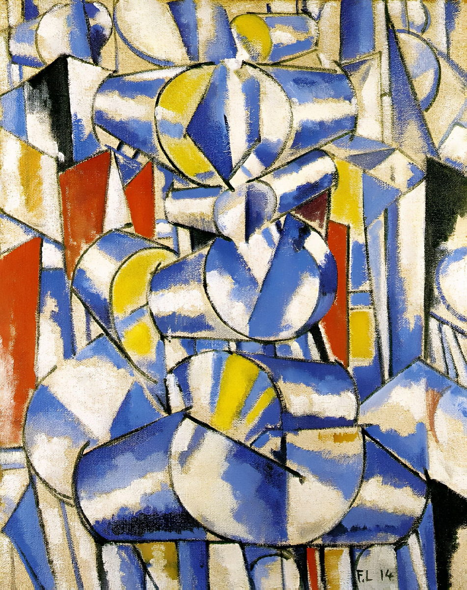 Reproduction de “Contraste de Formes 1” (1914) de Fernand Léger. Une œuvre cubiste (tubisme) abstraite et dynamique aux couleurs primaires.
