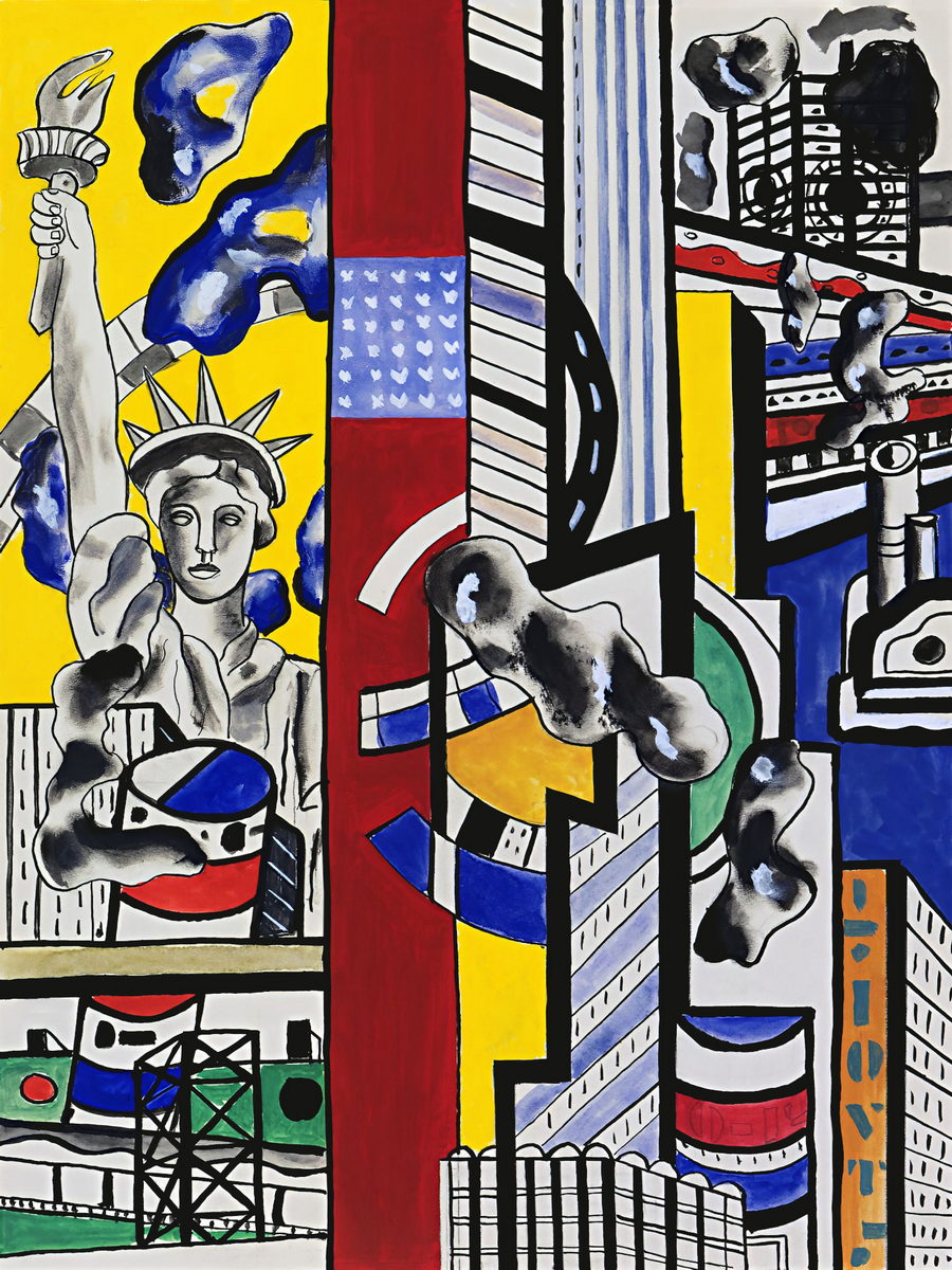 Reproduction de “Étude pour peinture murale cinématique 2” de Fernand Léger. Une composition vibrante de New York, avec la Statue de la Liberté.
