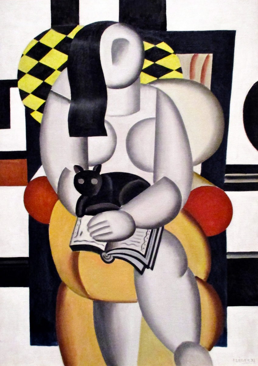 Reproduction de “Femme au Chat” (1921) de Fernand Léger. Un portrait puriste et cubiste d’une femme et son chat, en noir, blanc et jaune.