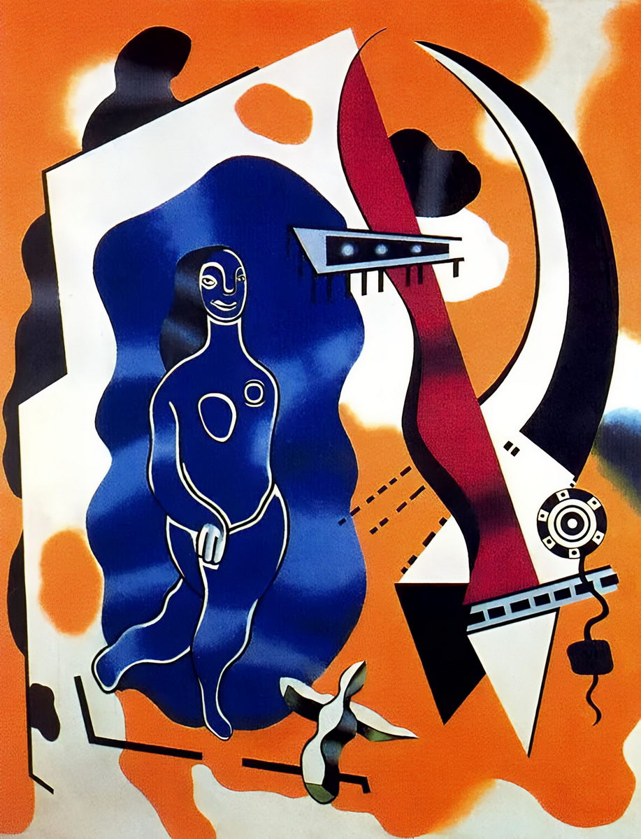Reproduction de “La Danseuse Bleue” (1930) de Fernand Léger. Une œuvre moderne et audacieuse contrastant une figure bleue et une abstraction mécanique.