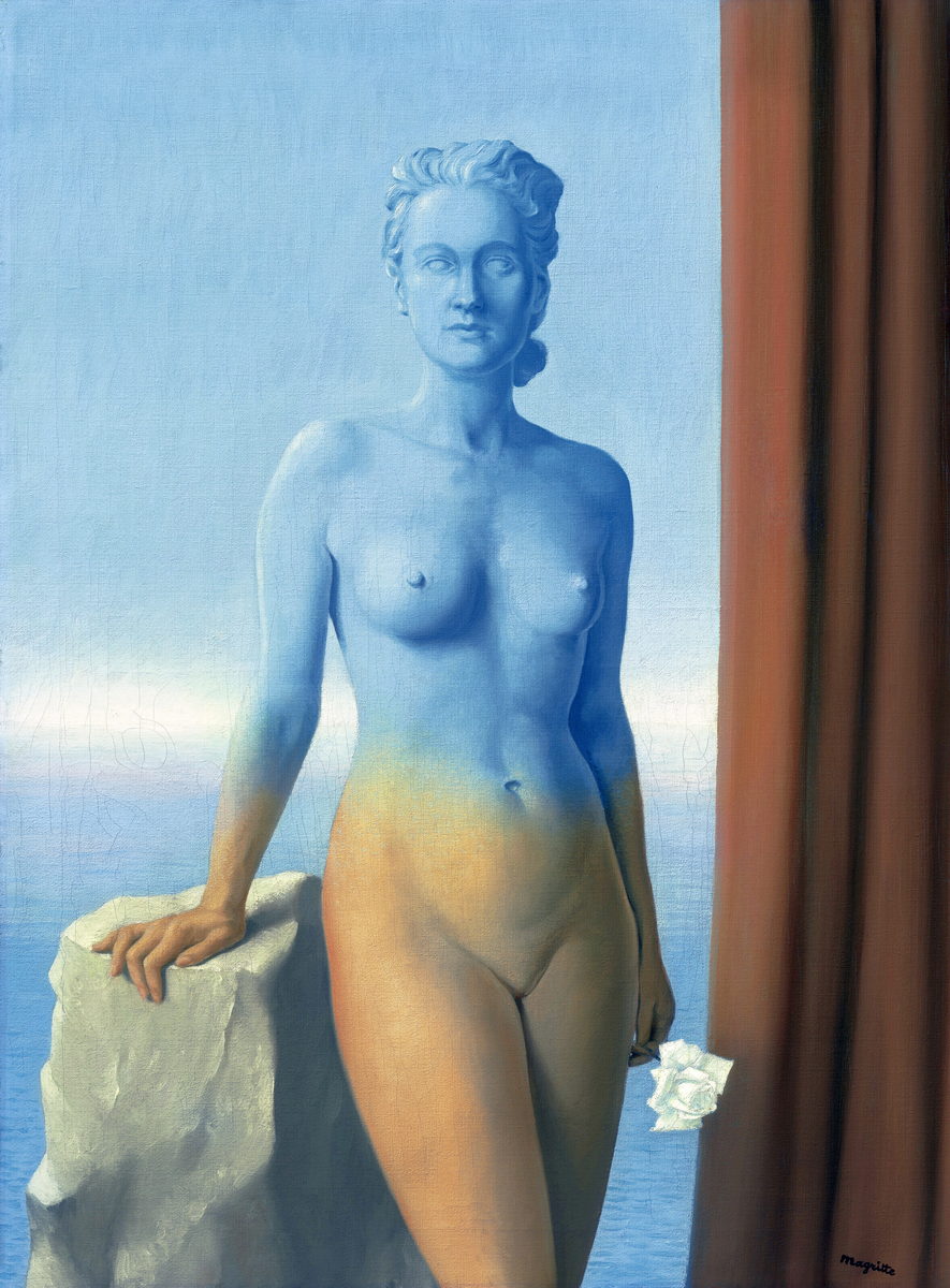 Changez votre déco avec “La Magie Noire 2” de Magritte. Une reproduction de peinture surréaliste d’une femme-ciel tenant une rose. Peinte à la main.