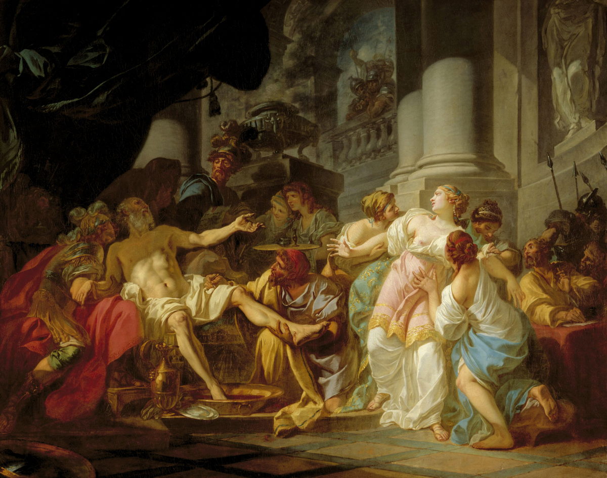 Reproduction de “La Mort de Sénèque” par David. Une œuvre de jeunesse dramatique et complexe, peinte à la main pour une immersion totale dans la scène.