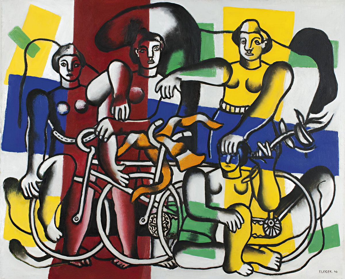 Reproduction de “Les Belles Cyclistes” (1944) de Fernand Léger. Une peinture moderne et colorée célébrant les loisirs et les cyclistes.