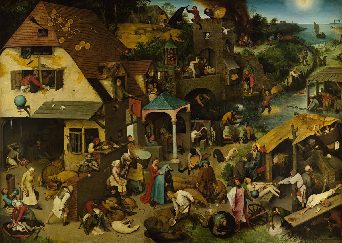 Reproduction de la célèbre peinture “Les Proverbes flamands” de Bruegel. Une œuvre d’art complexe et satirique, riche en détails et en culture populaire.