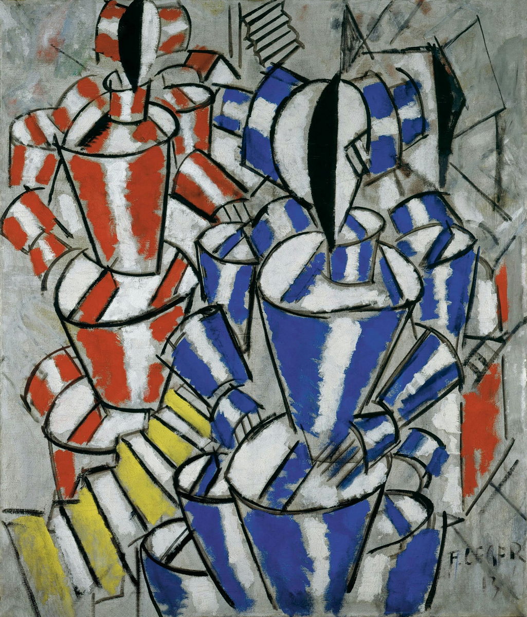 Reproduction de “L’Escalier” (1913) de Fernand Léger. Une œuvre cubiste (tubisme) dynamique de figures robotiques aux couleurs vives.