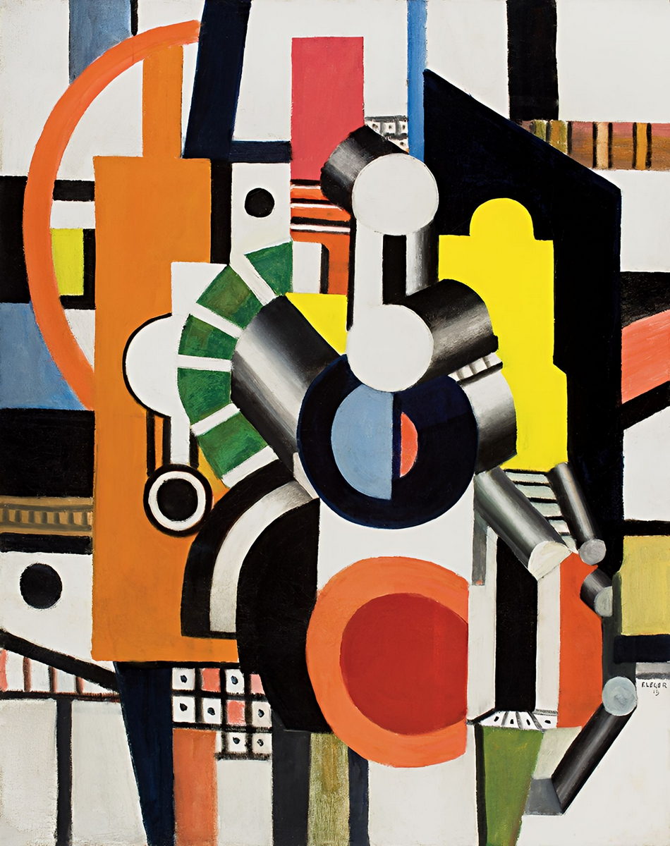 Reproduction de “Mechanical Element” (1924) de Fernand Léger. Une œuvre cubiste et mécanique aux couleurs vives (orange, jaune, rouge) et formes tubulaires.